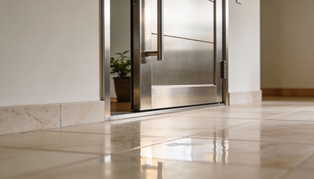 Alumínio e PVC são as escolhas mais seguras. Eles resistem à umidade, variações climáticas e oferecem vedação superior. Por isso, crescem tanto as buscas por portas de pvc em São Paulo e portas de alumínio sob medida.